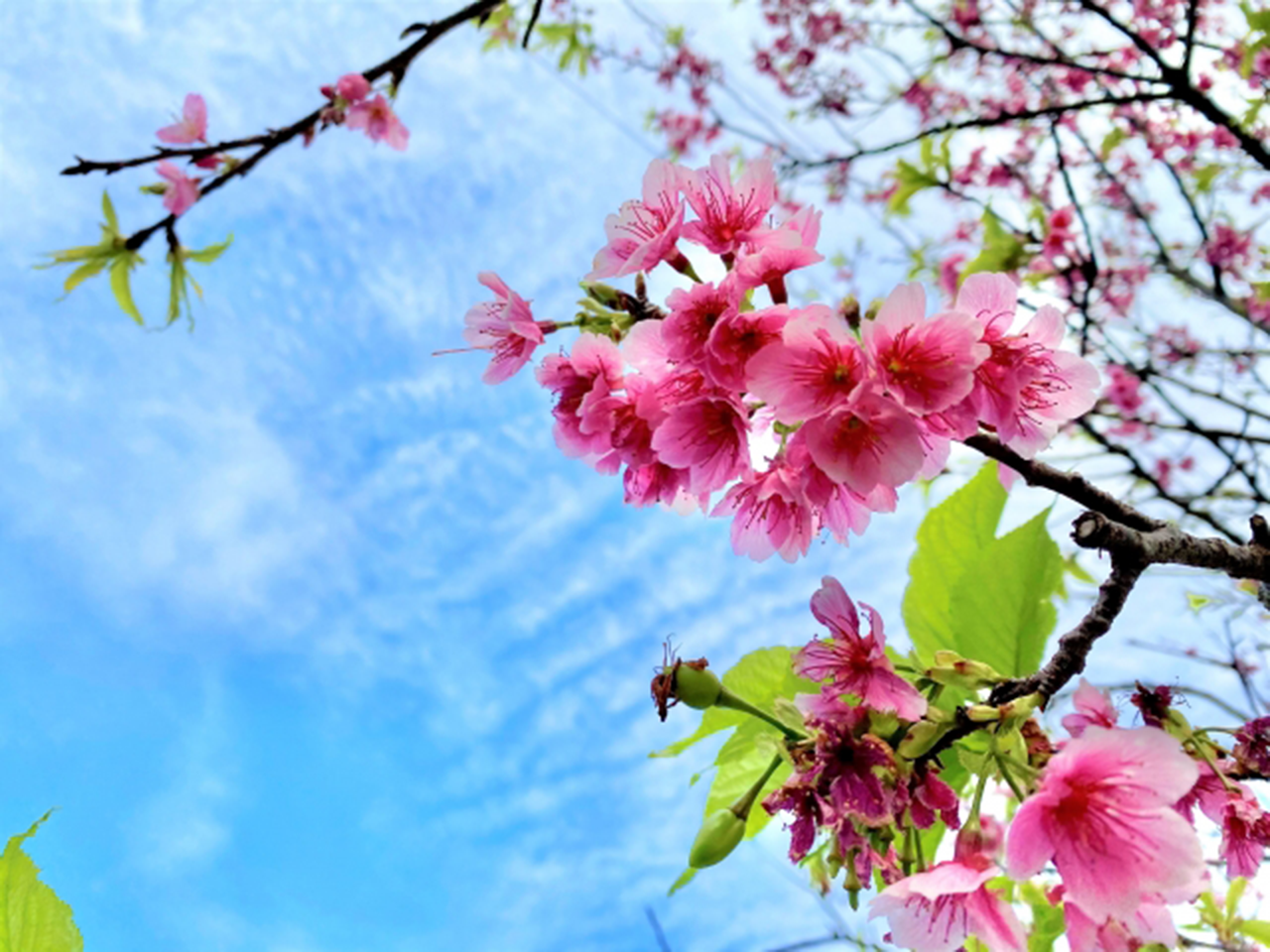 本土よりひと足早く、1月中旬から濃いピンクの寒緋桜(かんひざくら)が咲き、南国の空を鮮やかに彩ります。